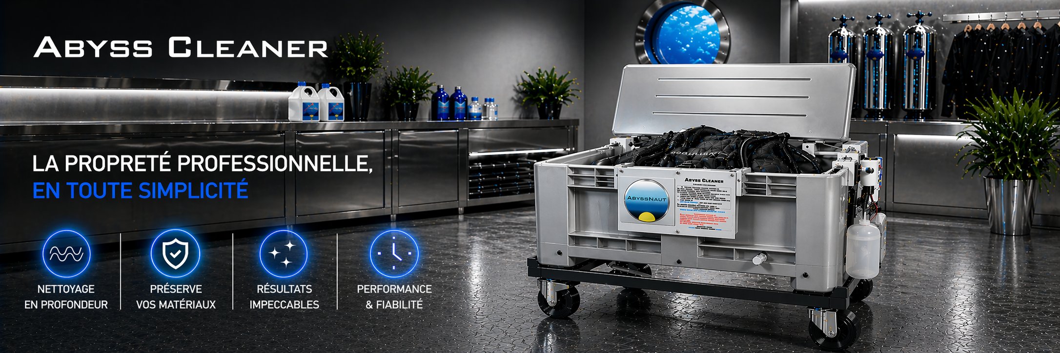 AbyssCleaner est l’outil indispensable pour la désinfection des vêtements néoprène de plongée-sous-marine par trempage.