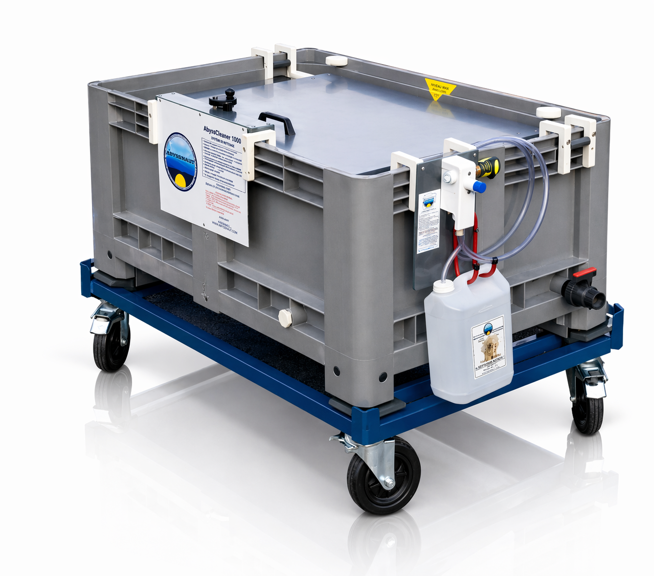 La centrale de dilution permet automatiquement de doser le volume optimal de produit d’entretien désinfectant pour néoprène AbyssNaut SeptiOne Pro, ou désinfectant Matériel, quelque soit le volume de solution distribué dans la cuve.
