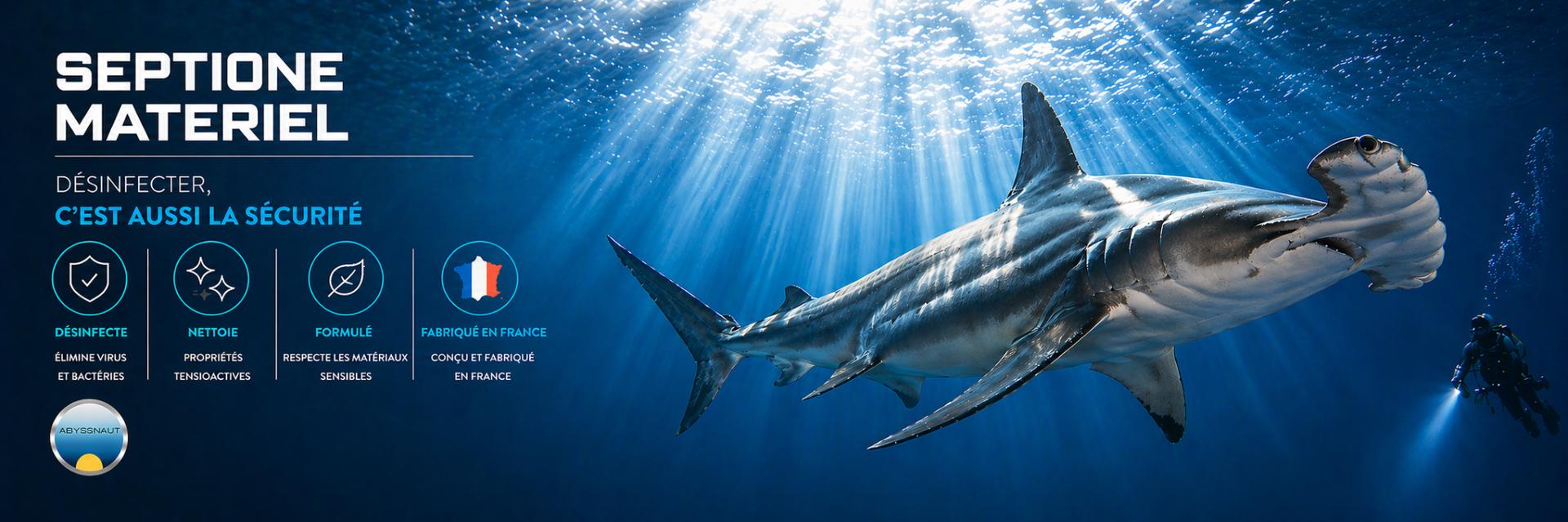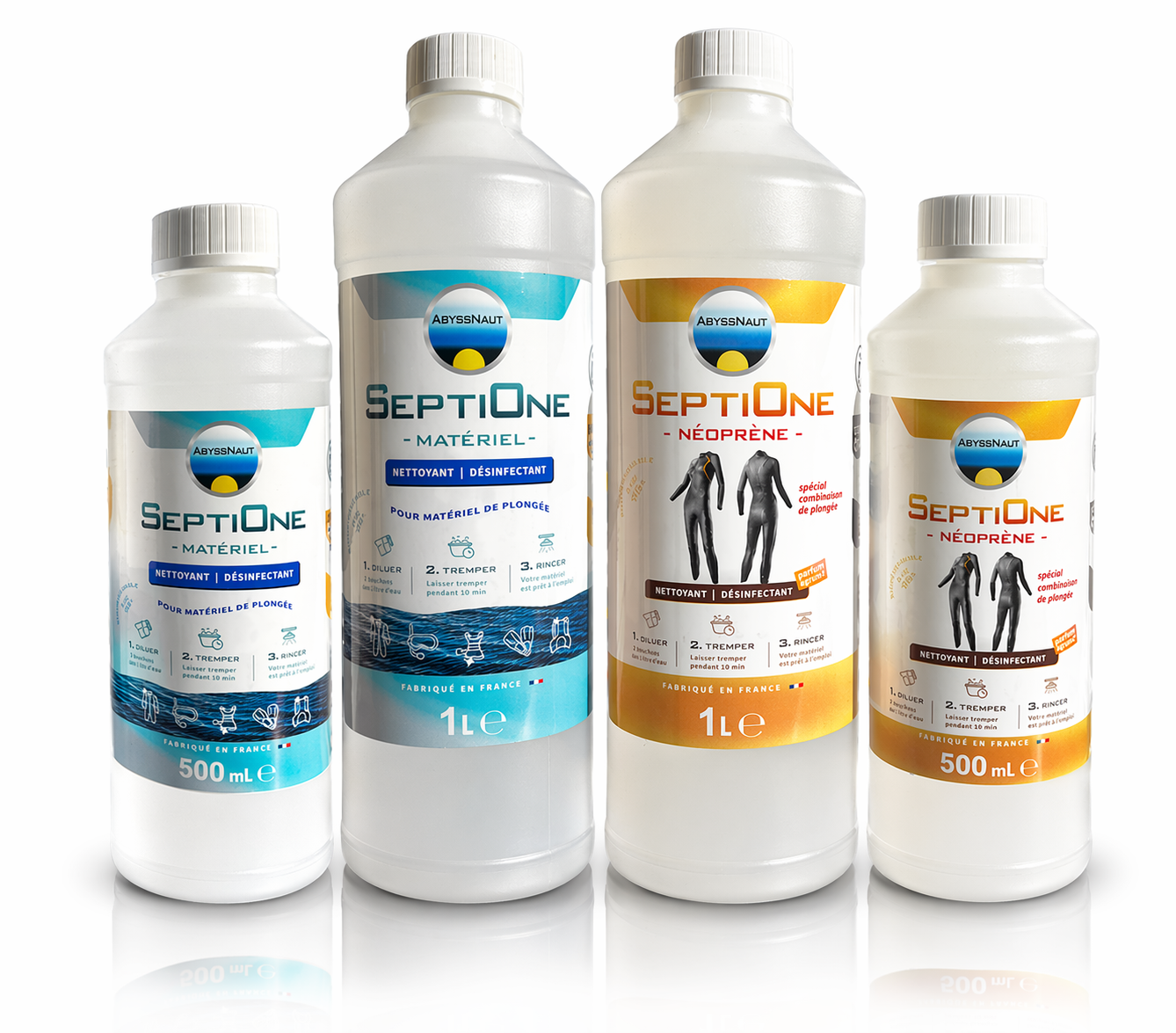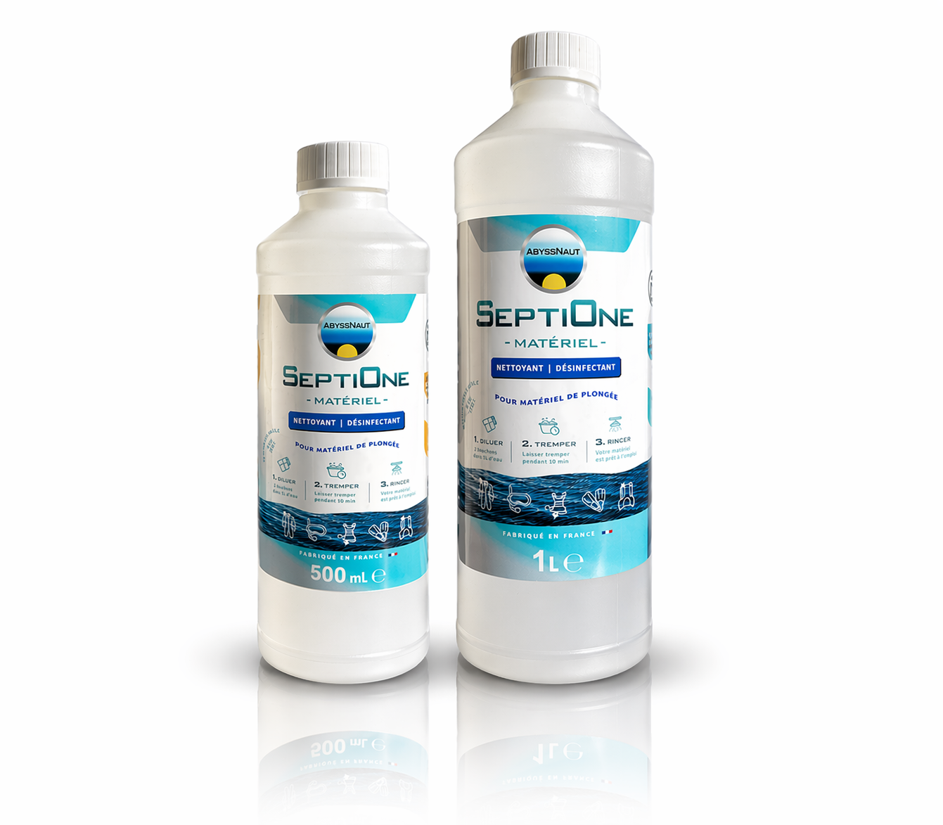 SeptiOne Matériel est le produit d’entretien et de désinfection par trempage pour tout le matériel de plongée: détendeur, masque, palmes chaussantes, combinaison néoprène… assure la propreté et contribue à la longévité des mécanismes.